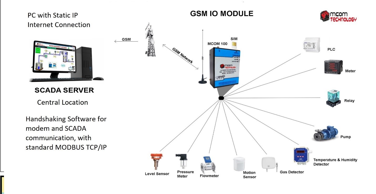 MCOM400IRTU is a rugged cellular MODEM offering state-of-the-art mobile connectivity for machine to machine (M2M) applications. It works in intelligent mode. This device is suitable for data monitoring and operation from remote device. It supports three digital input, two digital output and one analog input, 1 pulse and one RS485/232, any MODBUS communication via serial port which works as Master. The minimum data rate from remote to central server is 20 sec.